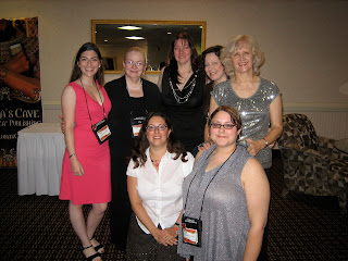 | Shoshanna Evers posing with her Rising Star award and the Ellora’s Cave cover models at Romanticon 2010 |